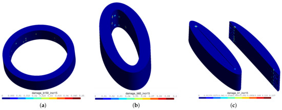 To reinforce this reasoning, the study is completed by a test case with mm () and is considered as the borderline case. Figure 6 illustrates the different damage zones detected after 15 increments for . Note that the damage d did not reach one yet. In other words, the results show the state of the rings before any crack initiation. Notice that, as expected, the different damaged zones are almost equi-distributed for the perfectly circular ring (Figure 6a) due to the equal opportunity of damage and crack initiation. As the ratio increases, the damaged zones are more and more located in the major axis vicinity (Figure 6b), and their position converges towards the singularity when (Figure 6c).