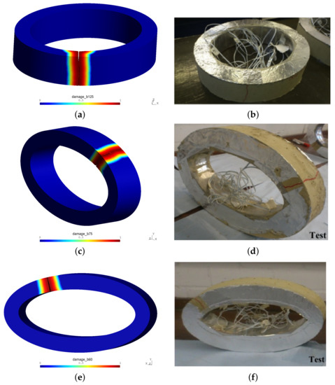 In addition, a comparison between the numerical results issued from the TLS model and the experimental ones collected from [17,27] is presented in Figure 7. The latter comparison not only shows a good agreement between the numerical and experimental campaigns, but also confirms that both damage and crack positions are affected by the oblateness severity. For the slightly elliptical ring (), one crack passing through the wall thickness is visible lightly close to the minor axis (Figure 7a,b). As b decreases, the position of the crack moves closer towards the major axis (Figure 7c,e).