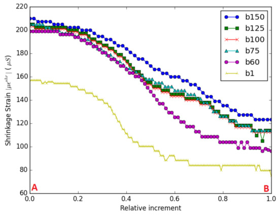 Shrinkage strain evolution for the different ratios limited between the first damage and the first crack initiation (i.e., between Points A and B).
