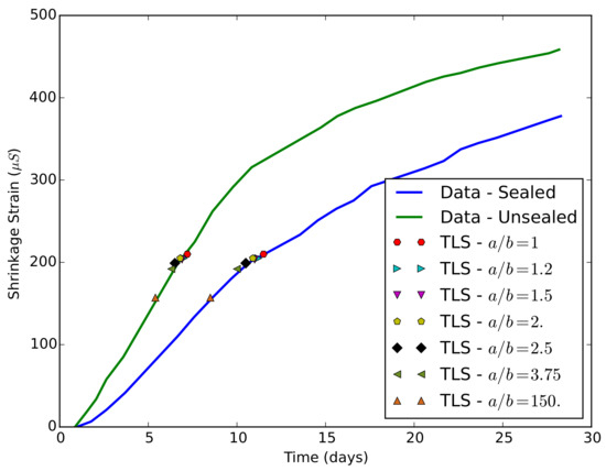 The authors of [17,27] determined that “Cracking ages of the circular ring and elliptical rings with , i.e., in this case or 100 mm, are all close to 15 days. However, elliptical rings with , i.e., in this case or 60 mm, cracked much earlier at around 11 and 13 days, respectively, on average”. Aiming to determine a time interval, values summarized in Table 2 are placed on the free shrinkage experimental measurements obtained by [17,27]. Figure 11 illustrates two different scenarios where numerical shrinkage values are linked to free shrinkage data for respectively sealed and unsealed specimens.