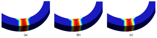 Notice that a small crack appears on the top outer side of the ring in Figure 12a, followed by similar ones on the inner upper and outer bottom sides of the ring, respectively illustrated in Figure 12a,b. The cracks grow closer and then merge to form one single crack going through the ring wall (see Figure 7a). This information is very important for industrial cases where the position of the initial crack and the interaction between neighbor cracks is crucial.