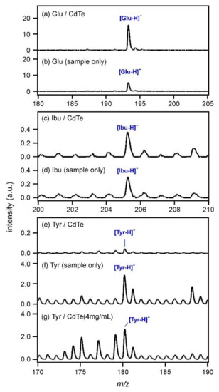 For other compounds containing carboxyl groups, MALDI MS was carried out using CdTe nanoparticles (0.5 mg/mL) as the matrix, and the obtained spectra in the negative ion mode are shown in Figure 2. The peak intensity of Glu ([Glu−H]−; m/z = 193.2) shown in Figure 2a was increased compared with that obtained without CdTe (Figure 2b). In addition, the peak intensity of Ibu ([Ibu−H]−; m/z = 205.3) was slightly increased by using CdTe, as shown in Figure 2c,d. However, that of Tyr ([Tyr−H]−; m/z = 180.2) almost disappeared when the CdTe matrix was used (Figure 2e,f). The pKa values were known as 2.9 for Sal, 3.2 for Glu, 4.5 for Ibu, and 2.2 for Tyr. As Tyr has the strongest acidity, the structure of the conjugate base must be the most stable among those four compounds. However, Tyr is an amino acid; it has an amino group as well as a carboxyl group. When a carboxylate anion was produced in a Tyr molecule according to Equation (3), it was expected that the amino group would catch a proton or an alkali metal cation to keep the molecular charge neutral. On the other hand, when Tyr crystals were photoexcited (Figure 2f), the same amounts of [Tyr + H]+ and [Tyr−H]− ions were produced. Therefore, charge neutrality of the system was kept even after the photoexcitation and it was assumed that the buffer action of a Tyr molecule unlikely occurred, yielding a moderately intense peak (Figure 2f). Therefore, the concentration of the CdTe matrix was changed to 4 mg/mL in order to increase the number of electrons that could react with Tyr, and MALDI MS of Tyr was re-examined. The result is shown in Figure 2g. The peak intensity of [Tyr−H]− was increased compared with that in Figure 2e, although the intensities of the other peaks were also increased. Therefore, it might be possible to consider that the deprotonation of Tyr was promoted as a large number of electrons that could overcome neutralization were generated from CdTe nanoparticles at 4 mg/mL.