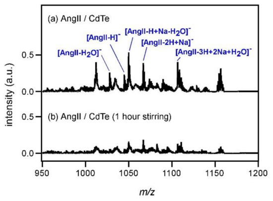 Mass spectra of angiotensin II (AngII) measured (a) with CdTe and (b) with CdTe after stirring for 1 h.