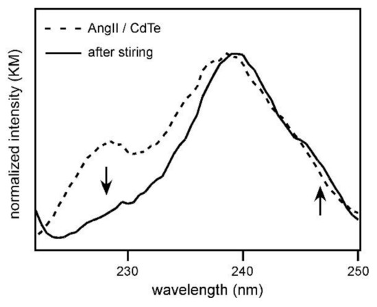 Diffuse reflectance spectra of mixed crystals of angiotensin II (AngII) and CdTe before and after stirring for 1 h.