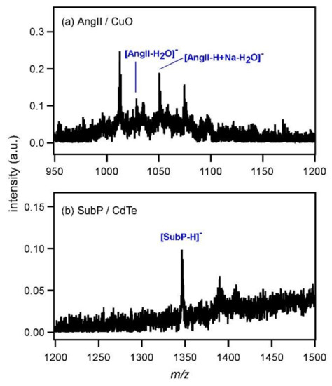Figure 6a shows the mass spectrum of AngII measured with CuO (4 mg/mL). The peak intensity was very low and the deprotonated peak of AngII was not observed. In addition, another peptide, substance P (SubP), was subjected to MALDI MS using CdTe as the matrix (0.5 mg/mL) (Figure 6b). The peak of [SubP−H]− was observed at m/z = 1346; however, its intensity was also very low. When the concentration of CdTe was increased to 4 mg/mL, the peak of [SubP−H]− disappeared (not shown). By increasing the amount of CdTe, strong electrostatic binding occurred between CdTe and all SubP molecules so that the desorption of SubP was not possible anymore. The molecular weight of inorganic MALDI matrix, such as metal or semiconductor particles, is often higher than that of organic MALDI matrix. Therefore, metal or semiconductor particles hardly desorb to the gas phase and no plume is produced after the photoexcitation. This aspect may be also unfavorable for the desorption of relatively heavy analytes, such as peptides.