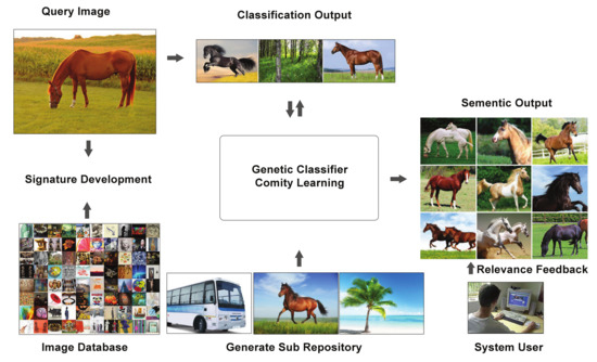 The main idea behind this work is that all the images present in the image repository are represented in the form of feature vectors. These feature vectors serve as image signatures to represent the visual attributes of the images. From this feature repository we select a subset of feature vectors from each of the N classes and generate a training repository. As this sub-repository has the representation of the images of the N different classes, therefore samples in each class are naturally skewed compared to the total number of samples of other classes; therefore, before classifier training, we overcome this problem by re-framing the multi-class image classification problem into multiple one class image classification problems. For this, for each class of concern we generate a growing set of positive samples in the class through GA by following an asymmetric and symmetric bagging-based process. The asymmetric and symmetric bagging-based process overcomes the class imbalance problem and provides a working base for the SVM and ANN classifiers. For image classification, we combine the opinions of multiple classifiers through classifier comity learning and as the classification efficiency is strongly dependent upon the training sets that are obtained through the GA, we named the classifier comity learning method as the Genetic classifier comity learning (GCCL) method. Once the classifier training is successfully done, we obtain the semantic association of the query image with respect to the N training classes, and generate the output image-set. Our output image-set comprises of the samples of the obtained semantic class of the query image. For this we compute the distance amongst feature vectors of the query image and feature vectors of the image samples of the obtained semantic class and return the output set comprising images of the closely matched feature vectors. If the output set contains the samples of unwanted classes, then we suppress these samples through relevance feedback. The relevance feedback retrains the model over the user feedbacks in the output set, where images are labelled as either relevant or irrelevant by the system user. Once the retraining is done, the final output is generated, otherwise the user can provide the feedback again. The details of the process are provided in Figure 2 and are discussed in detail in the following subsections.