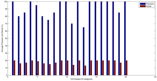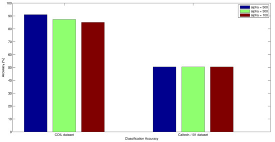As described in Equation (18), the objective function selects the chromosome population amongst different chromosome populations. In order to evaluate the optimal value for the parameter , we have provided the classification comparison over COIL and Caltech-101 datasets. The results of the comparison are presented in Figure 14. From the results we can observe that the algorithm gain performance benefit in case of COIL dataset with higher values of parameter . Whereas, in case of the Caltech-101 dataset the performance remain constant. The foremost reason behind this performance behaviour is that if the most optimal chromosome population is reached earlier the higher values of parameter will have no impact over the retrieval performance. However, to explore the search space in a better way for obtaining the optimal chromosome population, higher values of parameter are preferred. The impact of higher values of parameter can be observed in case of COIL dataset. Due to this reason the value of parameter in our implementation is set as 500.