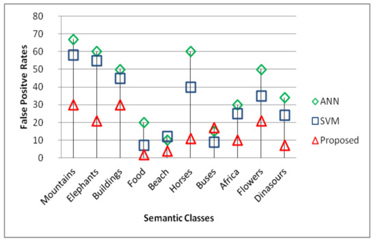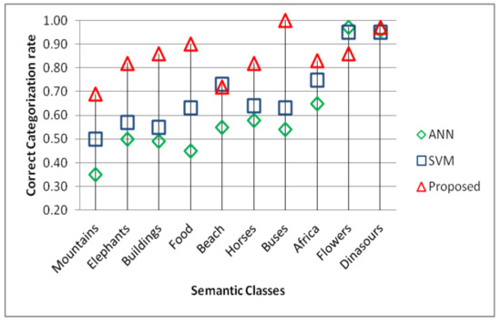 Image retrieval comparison against artificial neural networks (ANN) and support vector machines (SVM) classifiers in terms of precision.
