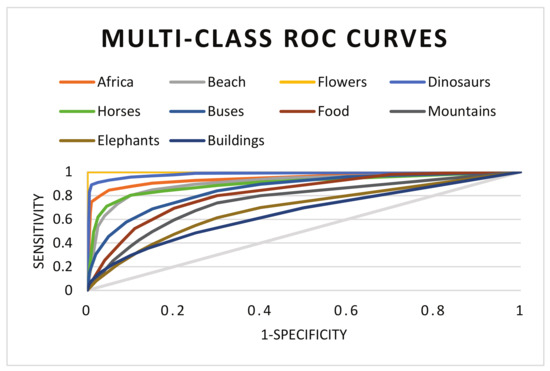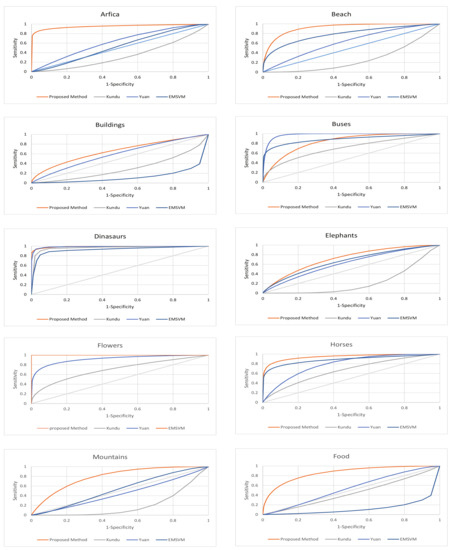 As in our implementation we are performing the image classification by mapping the multi-class problem in the form of multiple binary classification problems, therefore, we have also evaluated the classification performance through the ROC measure. Classification rates of the proposed method are compared against several existing systems of CBIR in terms of area under the ROC curve (AUC). The comparative methods are those of Kundu et al. [49], Yuan et al. [54], and Ensemble based SVM [42]. Classification performance in terms of ROC curves are plotted in Figure 9 and Figure 10. From the results it can be observed that the classification results of the proposed method are far better then the comparative methods, that clearly shows its reliability and effectiveness.