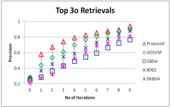 Comparison of the proposed method in terms of precision on top 30 retrievals against genetically optimized support vector machines (GOSVM), generalized biased discriminant analysis (GBDA), biased discriminant euclidean embedding (BDEE) and direct kernel biased discriminant analysis (DKBDA).
