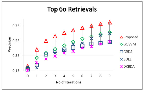 Comparison of the proposed method in terms of precision on top 60 retrievals against GOSVM, GBDA, BDEE and direct kernel biased discriminant analysis (DKBDA).