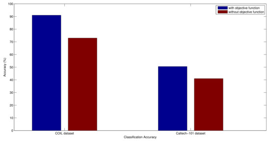 The objective function used in Equation (18) ensures that the GA receives good features in every generation that results in the form of improved classification performance. In order to justify this argument, we have designed an experiment where we compare the classification performance of the proposed method over COIL and Caltech-101 datasets with and without objective function. In the case when the objective function is not used, then we generate a single chromosome population instead of chromosome populations.