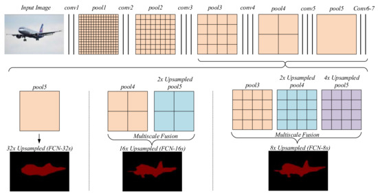 The 1st row of Figure 1 shows that the feature maps are derived from the input image by repeated convolution calculation and pooling operation. The convolution calculation is used to extract features which cannot change the resolution of the image or feature maps. Each pooling operation can reduce the resolution of the feature map by two times. Therefore, the resolution of the nth (n = 1, 2, …, 5) feature map is 1/2n of the input image. Based on these feature maps, the semantic segmentation result, with the same resolution of the input image, can be obtained by using upsampling and multiscale fusion techniques. The upsampling is introduced to increase the resolution of feature map. Multiscale fusion is used to acquire finer details from the feature maps of different scale. Three different combinations of upsampling and muliscale fusion are utilized to implement FCN-8s, FCN-16s, and FCN-32s. As shown in Figure 1, the feature maps used to generate the semantic segmentation results are from pool3, pool4 and conv7, which are 1/8, 1/16, and 1/32 resolution of the input image, separately. The detailed description is as follows: