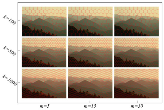The segmentation results of BSLIC algorithm under different input parameters. The image resolution is . From the first row to the third row, the parameter superpixels number k is 100, 500, and 1000. From the first column to the third column, the parameter weight factor m is 5, 15, and 30.