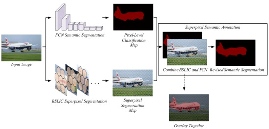 Based on the framework mentioned above, superpixel semantic annotation (Algorithm 1) combines the FCN pixel-level classification map and the BSLIC superpixel segmentation map, and it finally gets the revised semantic segmentation result.