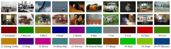 The used dataset in our work is PASCAL VOC 2012 with a total of 17,125 images. All of the targets are divided into 20 categories, excluding the background labeled as category 0. At the same time, in order to facilitate the expression of image semantics, PASCAL VOC 2012 assigns specific color labels and numbers to each category so that different categories of targets can be distinguished by color or numbers in image semantic segmentation. Figure 5 shows 20 categories of instance images and corresponding color labels. The dataset will be used to train and test the FCN network, and the detailed processed is shown as follows: