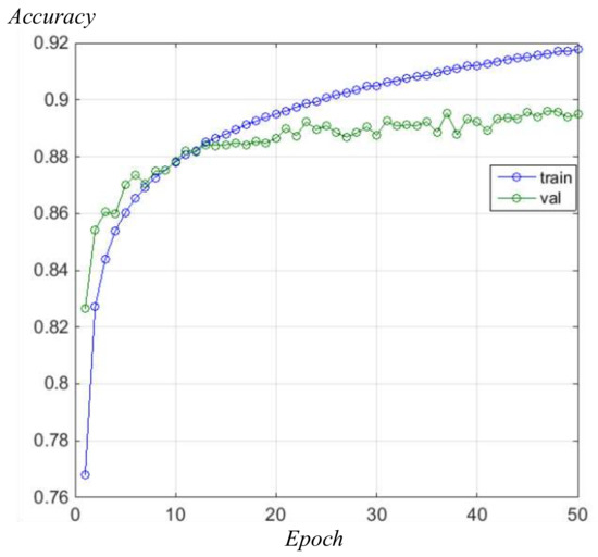 Thirdly, in order to have a better training result, we run the FCN for 50 epochs on training dataset. At the same time, we use pixel-level label to supervise the FCN-VGG16 model. The training model classification accuracy over the epoch of training is shown in Figure 6. The line that is marked by ‘train’ shows the relationship between the classification accuracy of training dataset with the epoch. The line marked by ‘val’ shows the relationship between the classification accuracy of the validation dataset with the epoch. Due to the randomness of the model parameter initialization, the classification accuracy of the validation dataset may be higher than that of the training dataset at initial epochs. Furthermore, the knowledge learning from the training dataset cannot suit the validation dataset well, so the curve ‘val’ becomes lower than the curve ‘train’ over epoch, leading to an intersection point around certain epochs.