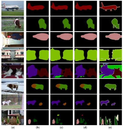 Due to the outstanding performance, FCN-8s is selected to be combined with BSLIC in our work. Our proposed algorithm is compared with three other methods: FCN-8s, FCN-16s, and FCN-32s. All of the test dataset from PASCAL VOC 2012 are processed by four algorithms. Owing to the better performance observed in Figure 7, FCN-8s is selected as the reference for comparison. Figure 8 compares the FCN semantic segmentation results with our semantic segmentation results. From Figure 8c,d, it is observed that the proposed algorithm can reach the same semantic recognition accuracy as FCN-8s. At the same time, the improved algorithm has a better accuracy when dealing with the small edges of the target, such as the wheel of aeroplane, the bird’s feet, the sheep’s ear, and the rear view mirror of a car in Figure 8d. In FCN-8s, small objects are often ignored and misclassified as background. In conclusion, the combination of FCN and BSLIC outperforms FCN-8s, FCN-16s and FCN-32s, especially the ability to keep the detailed structure of an object.