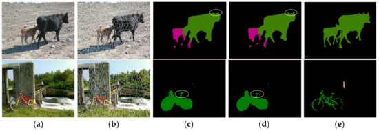 In Figure 4b, the situation of superpixel , which is the fuzzy edge of the image, meets criterion 4. 499 pixels (91.6%) in this superpixel are labeled by FCN as background. Consequently, the superpixel can be labeled as background directly.