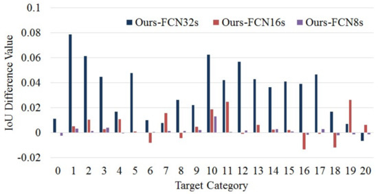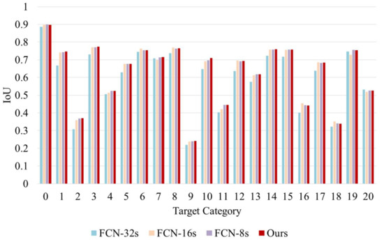 The comparison of IoU between our proposed algorithm and the FCN model are shown in Figure 9. The abscissa value may range from 0~20, representing the different categories in PASCAL VOC 2012. Figure 9 is plotted by the data in Table 3, which gives all the IoU in 21 categories.