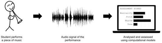 Learning to perform music is, therefore, a complex and time-consuming task at the core of music education. The average music student requires regular attention and feedback from a trained teacher to improve their performance skills in a holistic manner. The teacher is expected to provide a consistent and reliable assessment of multiple facets of a performance. These facets include, for example, pitch and rhythmic accuracy or general expressiveness. The ill-defined and subjective nature of these criteria result in high variance of such assessments amongst music educators [3,4]. In spite of these potential issues, subjective performance assessment is ubiquitous in music education: selection in ensembles/bands is determined through competitive auditions and progress is monitored through recitals. Hence, improving the reliability and consistency of music performance assessments can play a critical role in the music learning process. The focus of this article lies in developing data-driven computational models capable of understanding music performances so as to assess them along several criteria (see Figure 1). The key motivation is to provide reliable and reproducible feedback to students by introducing an element of objectivity to the process. A better understanding of both the objective parameters characterizing music performances and the main factors contributing to their assessment can also give us new insights into the production and perception of musical performance.