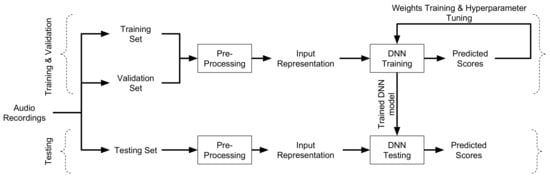 The proposed system uses a typical machine learning protocol comprised of two phases as shown in Figure 2: (i) a training and validation phase used to train the model and tune the hyperparameters; and (ii) a testing phase in which the model is evaluated. The available performance data consist of the audio recordings and the accompanying assessment ratings, which are used as ground truth. The data is first divided into three disjoint sets for training, validation, and testing. In the training and validation phase, the audio recordings of the performances are first passed through a pre-processing stage converting the raw audio signals into their corresponding input representations. These input representations are then fed into a DNN model that tries to predict the assessment ratings. The data in the training set is used to learn the model parameters. The model performance on the validation set is used to tune the hyperparameters. The testing set data is used to evaluate the model performance on unseen data following the same steps as above. The individual processing steps are explained in detail below.