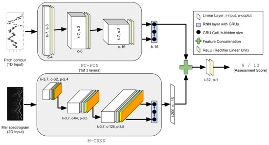 The architecture details of the model are shown in Figure 4a. There are four convolutional layers, each of which has three components: (i) a 1D convolution layer, (ii) a 1D batch normalization layer, and (iii) a rectifier linear unit (ReLU) activation layer. Based on pilot experiments, for the first three layers, kernel size and stride are set to 7 (approx. 40 ms resolution in time) and 3 respectively. For the last layer, the kernel size is set to 35 and the stride is taken as 1. The number of features progressively increases to 16 in the 3rd layer. Batch normalization is used to reduce over-fitting during training [60]. An average pooling layer is connected at the end to output a single assessment score irrespective of the length of the input PC. The only limitation of this kind of FCN architecture is that it assumes that there is a minimum length of PC, which, for our case, corresponds to roughly 6 seconds.