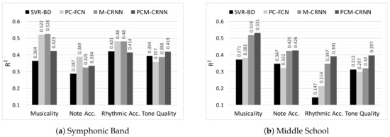- The best performance is observed for the assessment of Musicality. For both student categories, the best DNN models show clear superior performance compared to the SVR-BD model. It is worth noting that, among all the assessment criteria, Musicality is probably the most abstract and difficult to define. This makes feature engineering for Musicality rather difficult. The better performance of DNNs at this assessment criterion further indicates the capability of feature learning methods to model abstract concepts by learning patterns in data. Within the DNN models, those using RNNs consistently perform better for both student categories (except for PCM-CRNN for Symphonic Band). This shows the benefits of capturing temporal information for modeling this assessment criterion.