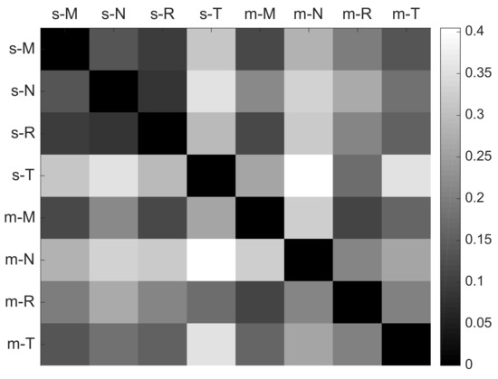 Cosine distance matrix between the weight vectors of the 1st convolutional layer of the Fully Convolutional Pitch Contourmodel (PC-FCN) for different (s: Symphonic Band, m: Middle School, M: Musicality, N: Note Accuracy, R: Rhythmic Accuracy, T: Tone Quality). Darker shade indicates lower distance.