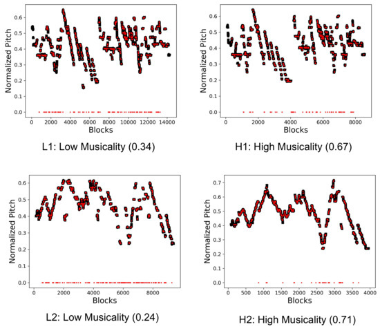 In the context of this work, we can use saliency maps to visualize which parts of an input pitch contour the model prediction is most sensitive to. The following analysis is again based on the PC-FCN model for the Musicality criterion. The saliency maps are shown in Figure 8. The input pitch contour is shown in black while the salient parts of the input are shown in red. On the left, there are two specific examples of Bb Clarinet performances from the 2014 Symphonic Band test set: student H1 who gets a relatively high Musicality rating (0.6) and student L1 who gets a low rating (0.35). These recordings are chosen due to their low prediction errors and a considerable difference between the assessment ratings. The contours themselves do not seem to reveal any obvious patterns; however, one interesting observation can be made: when compared to the pitch contour of student H1 (with the higher rating), there is a higher saliency of rests (0 value along the y-axis) in student L1’s pitch contour (with the low rating). A similar observation is also made for two other students from Middle school (Bb Clarinet, 2013) who have an even higher difference in Musicality ratings. The saliency maps are shown on the right of Figure 8. This can be explained through the impact of unwarranted repeated breaks during a performance that would tend to reduce an assessor’s perceptual rating of Musicality. Moreover, there might be a correlation between students who make mistakes during the performance and students with a high number of breaks.