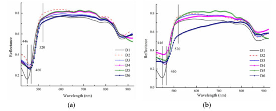 In both cases, for A. flavus and A. parasiticus, mycelia started to appear clearly on day 2, which were smooth and white, while conidia on A. parasiticus appeared earlier than A. flavus. On day 4, chartreuse conidia of A. parasiticus emerged. Additionally, when the conidia increased in number and matured, they became darker in color. For A. flavus, a few conidia formed on day 5, and their conidia were not as obvious as those of A. parasiticus. In order to further discriminate fungi inoculated for different days, average spectra of all the fungi samples in each day of A. flavus and A. parasiticus for different incubation days were calculated and are shown in Figure 2a,b.