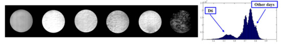 For A. flavus, spectra looked closely similar after 460 nm. For A. parasiticus, spectra on day 6 showed low reflectance responses in the spectral range from 520 to 700 nm, perhaps because with the mature of conidia, its color turned dark. The image of A. parasiticus at 520 nm was shown in Figure 4. Average reflectance response for day 6 at 520 nm was 0.56; it was 0.736 for other days. Thus, a threshold (0.65) can be used to divide A. parasiticus on day 6 and other days.