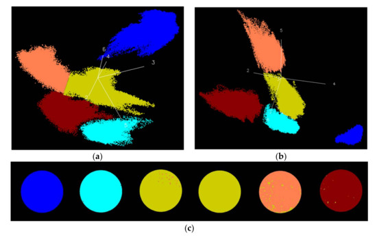 As individual score images of PC2 to PC6 can convey the differences between fungi with different incubation times, the score plot of these 5 PCs was further used to visually display fungi with different incubation times. When plotting PC2 to PC6 using the 5-dimensional visualization method and rotating the scatter plot in 5-dimensional PC score space, five distinct clusters of pixels apparently scattered in the score plot (Figure 6a,b). Classification plots were created by assigning each cluster to a class in the score plot and projecting it onto the image to form corresponding classification images (Figure 6c,d). The score plot and classification images of A. flavus were shown in Figure 6a,c. The blue cluster in the plot is associated with fungi on day 1 in the classification image, the cyan cluster is associated with day 2, the mustard cluster is associated with day 3 and day 4, the pink orange cluster is associated with day 5, while the red cluster is associated with day 6. Apart from the difference that was apparent in mycelia density, there were no significant changes between A. flavus on day 3 and day 4. This may cause the unclear distinguishment of A. flavus on day 3 and day 4. A. parasiticus was analyzed in the same way. The score plot and its classification image were shown in Figure 6b,d. The blue cluster in the classification plot is associated with fungi on day 1, the cyan cluster is associated with day 2 and day 3, the mustard cluster is associated with day 4, the pink orange cluster is associated with day 5, while the red cluster is associated with day 6. Because mycelia grew rapidly from day 2 to day 3, A. parasiticus on day 2 and day 3 were misclassified into the same group in the class result image. Similar classification result by PCA score plot was found in the previous study of Williams et al. [24]. The authors used PCA to group the kernels inoculated with fungi for different time intervals (0; 17; 20; 23; 26; 43; 69; 90 h). The maize kernels inoculated and incubated for 20–90 h were considered as one group, since the differences within maize kernels inoculated with fungi for 20–90 h were smaller than differences between groups of inoculated kernels for 20–90 h, uninoculated kernels, and inoculated kernels for 0–17 h.