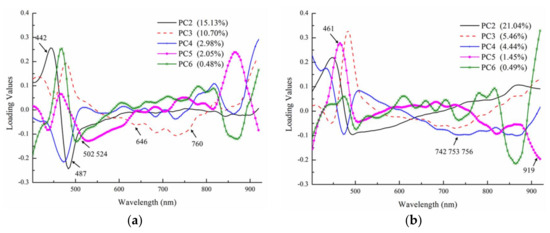 In earlier studies about using several optimal wavelengths to establish models, Yao et al. separated five fungi by using only three bands [18], while Sun et al. fitted growth curves for different kinds of fungi by characteristic wavelength in region of visible spectrum [7]. The authors pointed out that the characteristic wavelengths in visible region had good performance, because these wavelengths were associated with the variations of fungal color and texture during culture time. As shown in Figure 8, some of the selected wavelengths by CARS were also obvious peaks on the loading line plot. It also proves that the wavelengths selected by CARS are important wavelengths.
