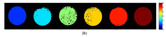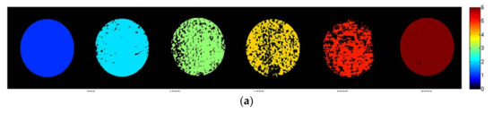 Prediction images were created to mark fungi with different incubation times in different colors. The prediction images were obtained by applying the optimal wavelengths SVM model to every pixel of the fungal hyperspectral image, respectively [17]. The prediction images of A. flavus and A. parasiticus were shown in Figure 9a,b, respectively. In the prediction maps, pixels that have the same predicted values have the same color, while black pixels in the Petri dish were not correctly classified. It should be noted that the growth of fungi in Petri dish was non-uniform. Thus, hyperspectral image of fungi incubated for different days still contains many similar pixels. This may cause some pixels to be wrongfully classified. Due to the similarity of A. flavus on day 3 and day 4, there was a serious misjudgment between day 3 and day 4. The misjudgment between day 2 and 3 for A. parasiticus may be caused by the same problem. In this work, in which 50% of the total number of pixels for an object was recognized as class members, the entire object was classified as a member too. After processing using this method, the identification accuracies reached 100% in the prediction image for the two fungi.