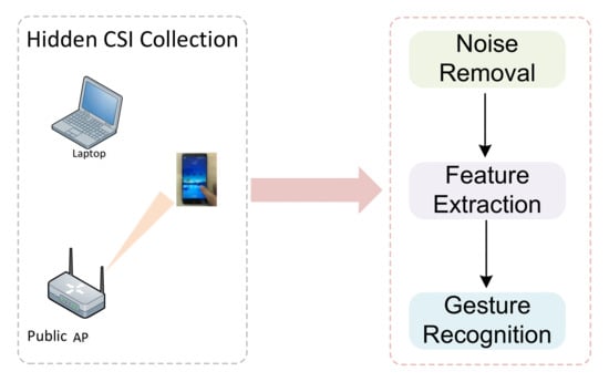 For the CSI-based sensitive information recovery model, there are several steps. First, noise needs to be removed from the obtained signal. After noise removal, it is necessary to extract the features and then use machine learning algorithms to recognize the input sensitive information, as shown in Figure 2.
