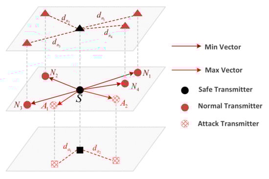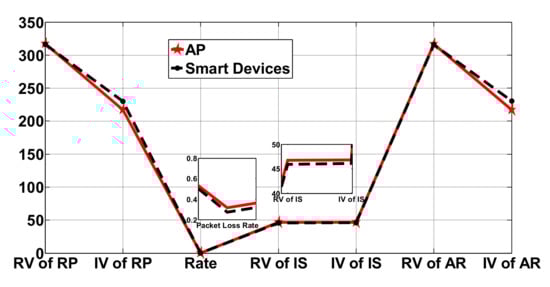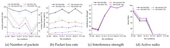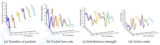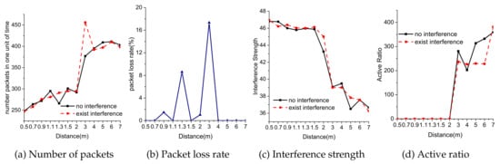 In Figure 10c,d, when the distance is less than 2 m, is high and is relatively low; when the distance is more than 3 m, decreases and increases sharply. Therefore, in order not to interfere with the other normal public APs, the distance between the safe wireless transmitter and the other normal public APs would be better when it is more than 4 m. When the distance is 4 m, the channel switch will not influence the communication of normal public APs. The longer the distance between the safe wireless transmitter and other normal public APs is, the smaller the impact of channel switching will be on the communication of normal public APs.