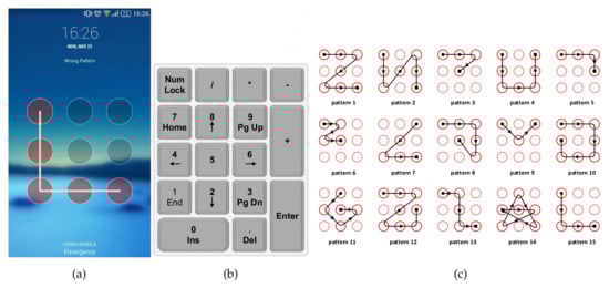 Two case studies. (a) Unlock patterns; (b) keystrokes; (c) 15 tested patterns for Android applications.