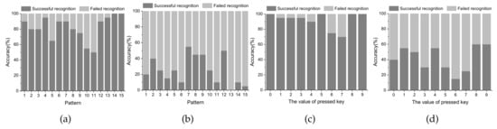The results of the recovery accuracy of the two case studies are shown in Figure 12. From Figure 12a,c, we know that when there is no channel interference, the recovery accuracy is relatively high: the average recovery accuracy of the 15 unlock password patterns is 82.33%, and the average recovery accuracy of the 10 keypads is 92%. The results of unlock patterns and keyboard recovery indicate that the wireless signal will reveal the user’s privacy, which should be a warning for users.