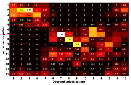 From Figure 12b,d, we know that when the channel interference exists, the recovery accuracy is relatively low, and the average recovery accuracy of the 15 unlock password patterns is 21.67%, and the detailed recovery results are shown in Figure 13; the average recovery accuracy of the 10 keypads is 42%, and the detailed recovery results of keypads for 20 times are shown in Figure 14. Compared with the recovery accuracy without channel interference, the recovery accuracy with channel interference significantly decreases. The results show that channel interference can defeat the CSI-based attacker effectively.