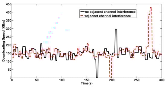 Prior research works have also demonstrated that the adjacent channel is harmful in the 802.11 network [33,38]. Akella et al. [17] validated that when there are plenty of wireless transmitters in a region, the co-channel interference will greatly reduce the network output: the output of TCP reduces from 9 Mbps–2 Mbps; the output of UDP also reduces, and it reduces from 9.7 Mbps–8.6 Mbps. In order to prevent the neighbor wireless transmitters from interfering with each other, there are many channel assignment methods proposed for WLANs [14,15,16,39].