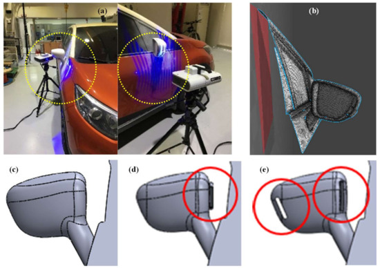 Three-dimensional (3D) scanning process to gather a 3D computer-aided design (CAD) model and three types of OSRVM models: (a) 3D scanning apparatus; (b) Extraction of the mirror shape from the scanned data; (c) Reference model; (d) Outer duct model; (e) Inner duct model.