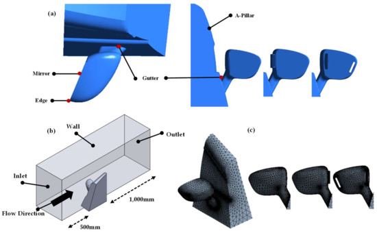 A cuboid computational domain was used to obtain the CFD solution in this approach, as illustrated in Figure 2b. It considers airflow rate and field, and the size of the computational domain is 580 mm × 800 mm × 2000 mm. The gutter, which is a small part of the A-pillar, is included in the computational domain to minimize the aerodynamic effect from the surrounding features during driving, since the vehicle body is placed in front of and to the rear of the OSRVM. The gaps on the gutter between the side mirror and A-pillar often provide flow separations. In addition, the mirror was mounted about 1000 mm downstream of the elliptically-shaped leading edge of the side plate, as illustrated in Figure 2b. In general, the main source of aerodynamic noise was the vortex and turbulent flow of the rear side, rather than the front side, of the mirror. Therefore, the computational domain was also set to the rear side of the OSRVM. This computational domain was based on the geometry considered by Olsson [16] and Wang et al. [17], which have studied the aerodynamic experiments of the side mirror and the feasibility of the aerodynamic simulation.