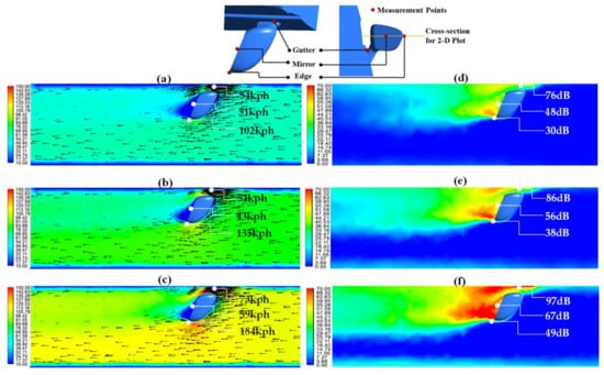 In general, the tonal noise occurs from the interaction of vortices with the gutter and edges of the side mirror. High levels of aerodynamic noises are generated in the gutter and edges during driving. Figure 3a–f show the CFD analysis results of the airflow velocity and the sound pressure levels (dB) around the reference OSRVM for three vehicle speed cases of 60 kph, 80 kph, and 110 kph at 23 °C temperatures and 50% humidity conditions. The value and region of aerodynamic flow rate and sound pressure level rapidly increase while the driving speed changes from 60 kph to 110 kph.