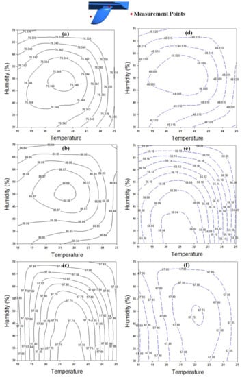 The graph chart of the sound pressure level of the reference OSRVM model for various relative humidities and temperatures: the gutter from (a–c) and the surface of the mirror from (d–f) for three speed cases of 60 kph, 80 kph, and 110 kph.