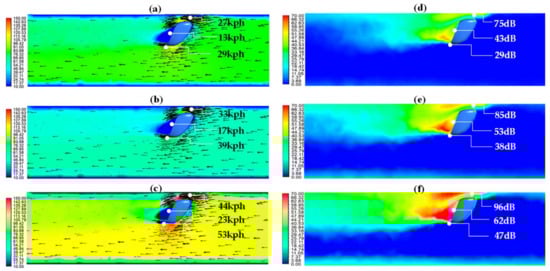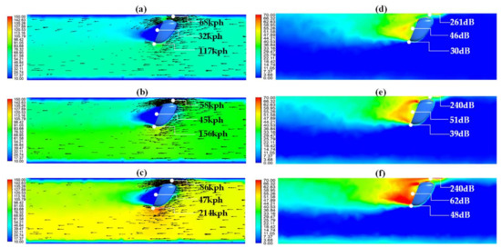 Flow velocity contour with vector field (a–c) and maximum sound pressure level (d–f) of the third OSRVM model with two inner ducts at 23 °C and 50% humidity condition for three vehicle speeds: (a,d) 60 kph, (b,e) 80 kph, and (c,f) 110 kph.