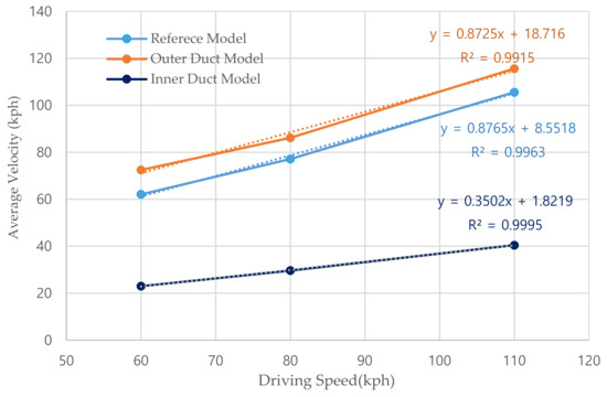 Figure 7 shows the average flow velocity of the three points (gutter, mirror, and edge) for the vehicle speeds (60 kph, 80 kph, and 110 kph). The increasing rate (slope) of the average velocity by the vehicle speed was similar for the reference and the outer duct models. However, the inner duct model shows the low rate of velocity change with the slope of 0.35. The addition of two inside ducts on the design of the mirror housing improved the homogenous airflow around the OSRVM.