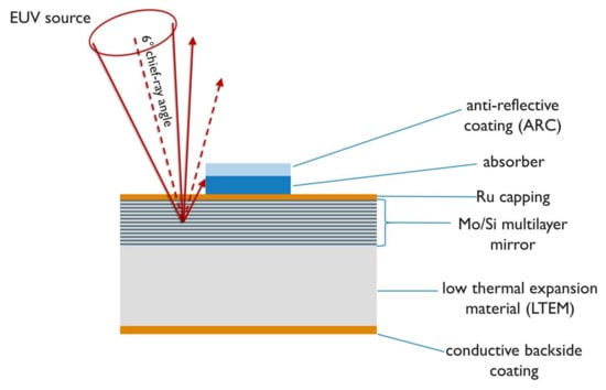 Extreme ultraviolet lithography is being industrialized as the next candidate printing technique for high-volume manufacturing of scaled down microcircuit devices for logic and memory applications. Because of the short wavelength of 13.5 nm used in extreme ultraviolet (EUV) lithography, it is not possible to use refractive optics or transmission masks for image formation, and the optical elements and EUV photomask are reflective mirrors. The EUV mask is a reflective multilayer (ML) mirror, consisting of molybdenum/silicon (Mo/Si) bilayers having peak reflectivity at 13.5 nm, and is coated with a mask absorber where light has to be attenuated. The chief-ray incidence angle on mask is set at 6° from normal to avoid overlap of incident and reflected light.