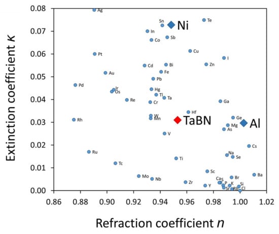 Figure 2 shows the relationship between n and κ at 13.5 nm EUV wavelength of elements from Z = 11 to Z = 83, excluding elements from the lanthanide series and noble gases []. Nickel (Ni) is one of the highest EUV absorbing elements, but it can easily form crystal grains [,,]. Alloying is an option to reduce Ni crystallinity []. Aluminum (Al) has non-negligible EUV absorption and n larger than unity. Based on rigorous imaging simulations, Al is expected to reduce M3D effects [,], but imaging contrast will deteriorate due to Al’s lower κ compared to Ta. By combining both elements into a NixAly alloy, we target a material that reduces EUV phase distortion, while maintaining good contrast for imaging at reduced absorber thickness.