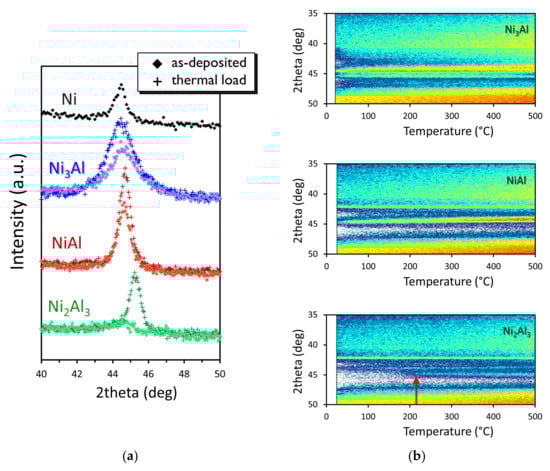 (a) X-ray diffractometry (XRD) spectra of Ni (black), Ni3Al (blue), NiAl (red), and Ni2Al3 (green). Samples as-deposited and after thermal load up to 500 °C, are represented by diamonds and plus signs respectively; (b) In-situ XRD (IS-XRD) spectra of Ni3Al, NiAl, and Ni2Al3, showing the evolution of diffracted intensity as function of the temperatures of measurement. The intensity scale is represented in a pseudo-color map, with white representing the lowest intensity, blue intermediate intensity and red highest intensity. Onset of Ni2Al3 recrystallization is indicated by the red arrow.